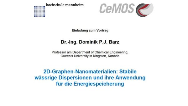 Dominik Barz gave a talk entitled “2D Graphene Nanomaterials: Stable Aqueous Dispersions and their Application for Energy Storage Devices” at the Professor Raedle’s Center for Mass Spectroscopy and Optical Spectroscopy, Mannheim University, Germany. CeMOS is the largest research institute at a University of Applied Science in the province of Baden Wuertemberg.